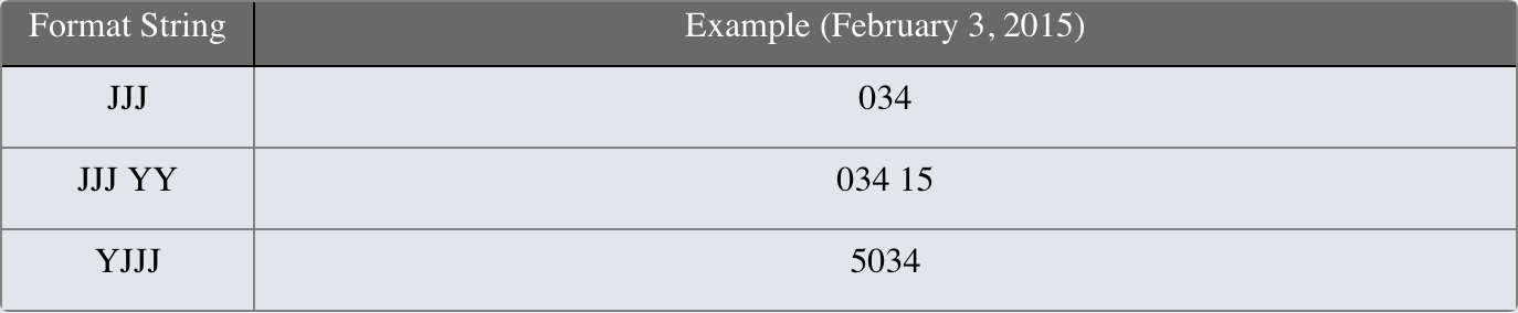 Julian (YJJJ) | These are special date fields that include the day of the year. This is represented by the "JJJ" in the format code. ![]() |