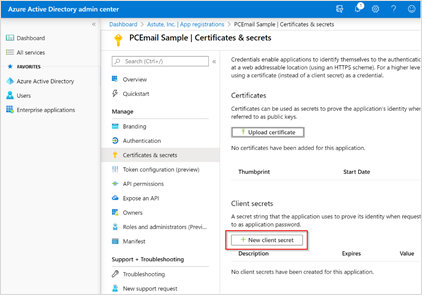On the Certificates and Secrets screen, click the New Client Secret button.