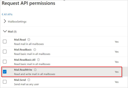 Select Mail (1). Then, select the Mail.ReadWrite check box.