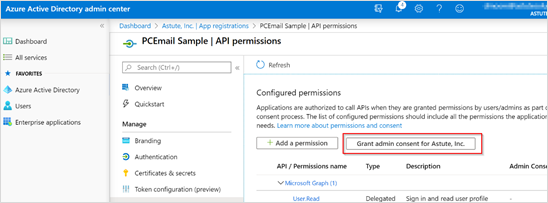 On the Configured permissions view, select User.Read and click Grant Admin Consent for Emplifi Inc.