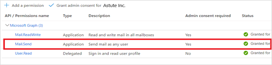 To verify the permissions were added, under Microsoft Graph, the Mail.Send permission should show a status of "Granted".