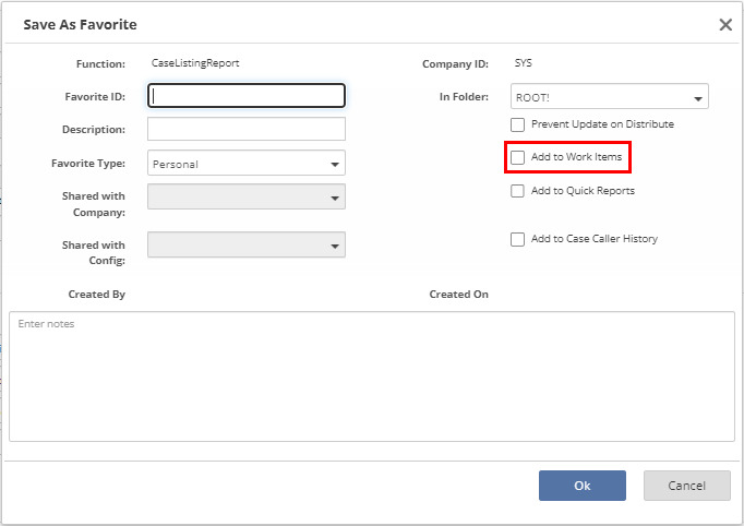 Click Ok. The favorite will display in the Work Items list on the Application Function Bar as well as on the My Favorites page.