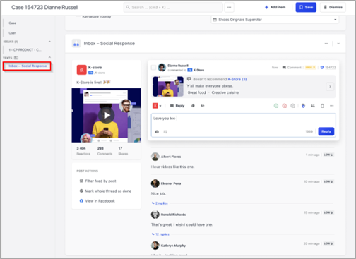 On the Case function bar, select Inbox – Social Response. The Inbox-Social Response section of the Case page will open.