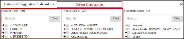 Select the driver categories (one or two depending on whether one or two were entered on the Suggestion tab), as well as the codes from the suggestion category.