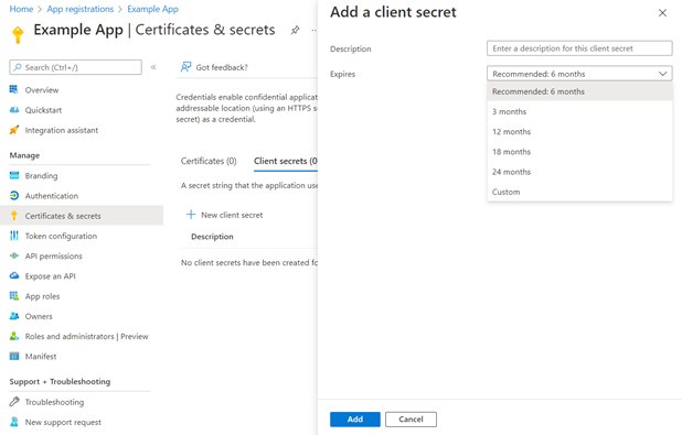 On the Add a Client Secret window, in the Description text box enter a name for the secret. Choose when the secret expires. You may choose up to 2 years.