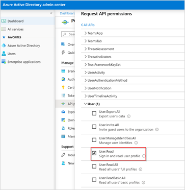 Under All APIs, select User (1). Then, select the User.Read check box.