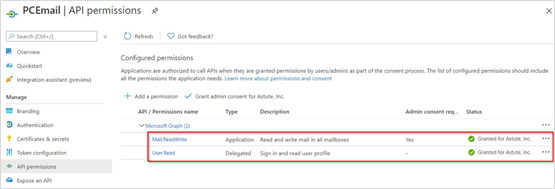 To verify the permissions were added, under Microsoft Graph, you should see both Mail.ReadWrite and User.Read with a status of "Granted".