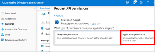 On the Request API Permissions window with Microsoft Graph selected, click Application Permissions.