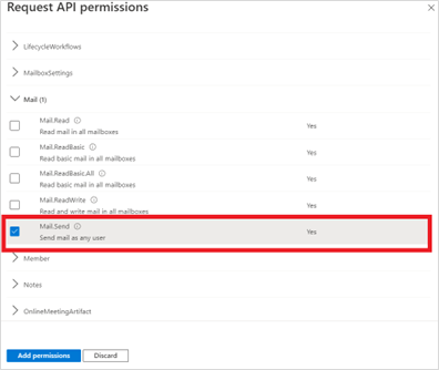 To verify the permissions were added, under Microsoft Graph, the Mail.Send permission should show a status of "Granted".