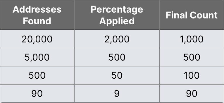 Random Sample Percentage | Enter a number 1 to 100 to specify the percentage of all addresses found to keep in the list. The Minimum and Maximum are then applied to this computed count. If the number of addresses found after applying all the filters exceed the computed count, the extras are chosen randomly in a uniform distribution and removed from the list, before saving the results. If the value is left blank, <1, or >100 the feature uses 100 as the percentage. A percentage of 100 means that they system returns all records up to the Maximum to Sample. This option only applies during the list creation. Later operations still work against the saved list of addresses. Example: ![]() |